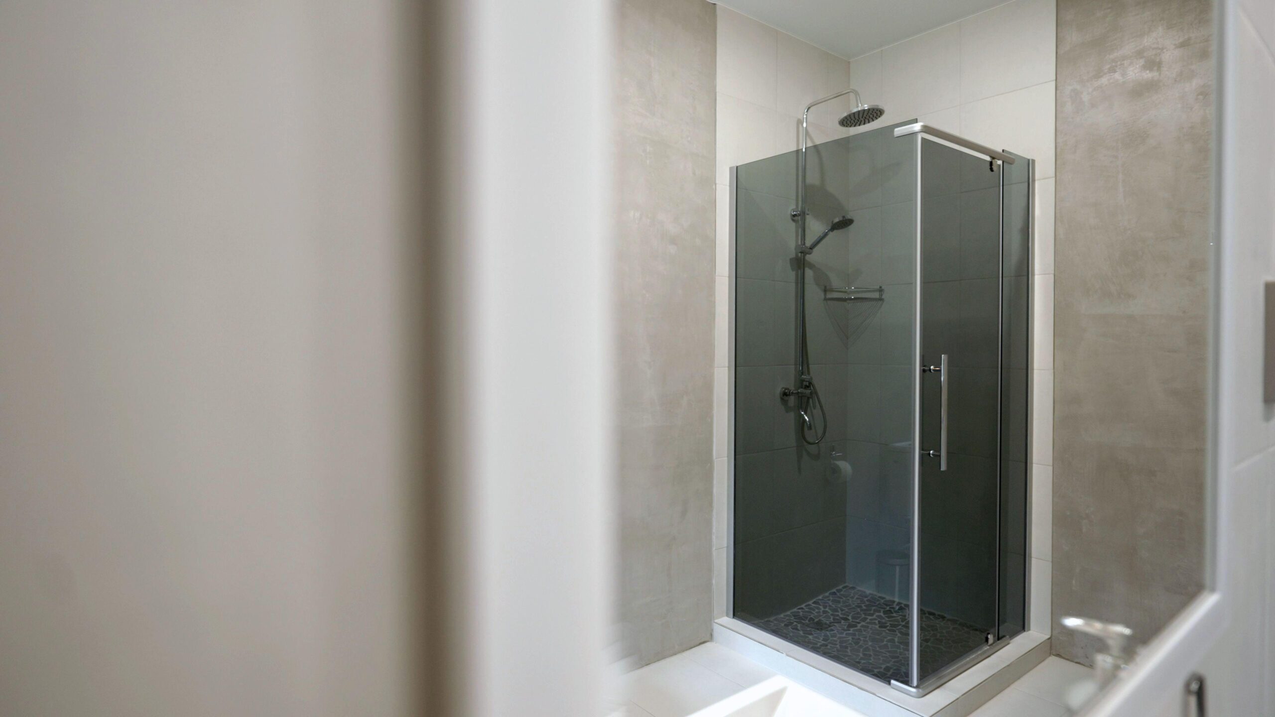 A glass walk-in shower creates an open visual flow and makes the room appear larger.